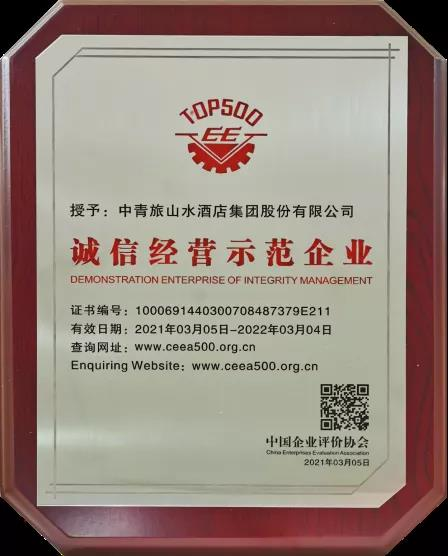 近日,中国企业评价协会(以下简称:中企评)传来喜讯,经中企评第三方信用服务机构(深圳市中品信用技术有限公司)初审、中企评信用专业委员会专家复审,中青旅山水酒店集团股份有限公司通过“诚信经营示范企业”评审,并由中企评颁发了“诚信经营示范企业”荣誉证书。