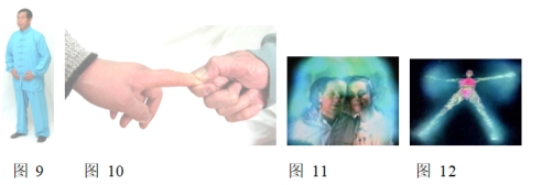 图1,11,12三图,是我于2010年底参加医学气功年会,在分组讨论时说循经为何能通脉?是因为手有气,与经脉气融为一体,循经运行,就把经气拽着走。本书第二主编章文春教授当时参与本组讨论会,他补充说是人体生物场。2011年初我到网上搜索人体生物场,结果出现美国 POWER AVS人体辉光摄像显示仪,及其产品:以上的人体辉光图。